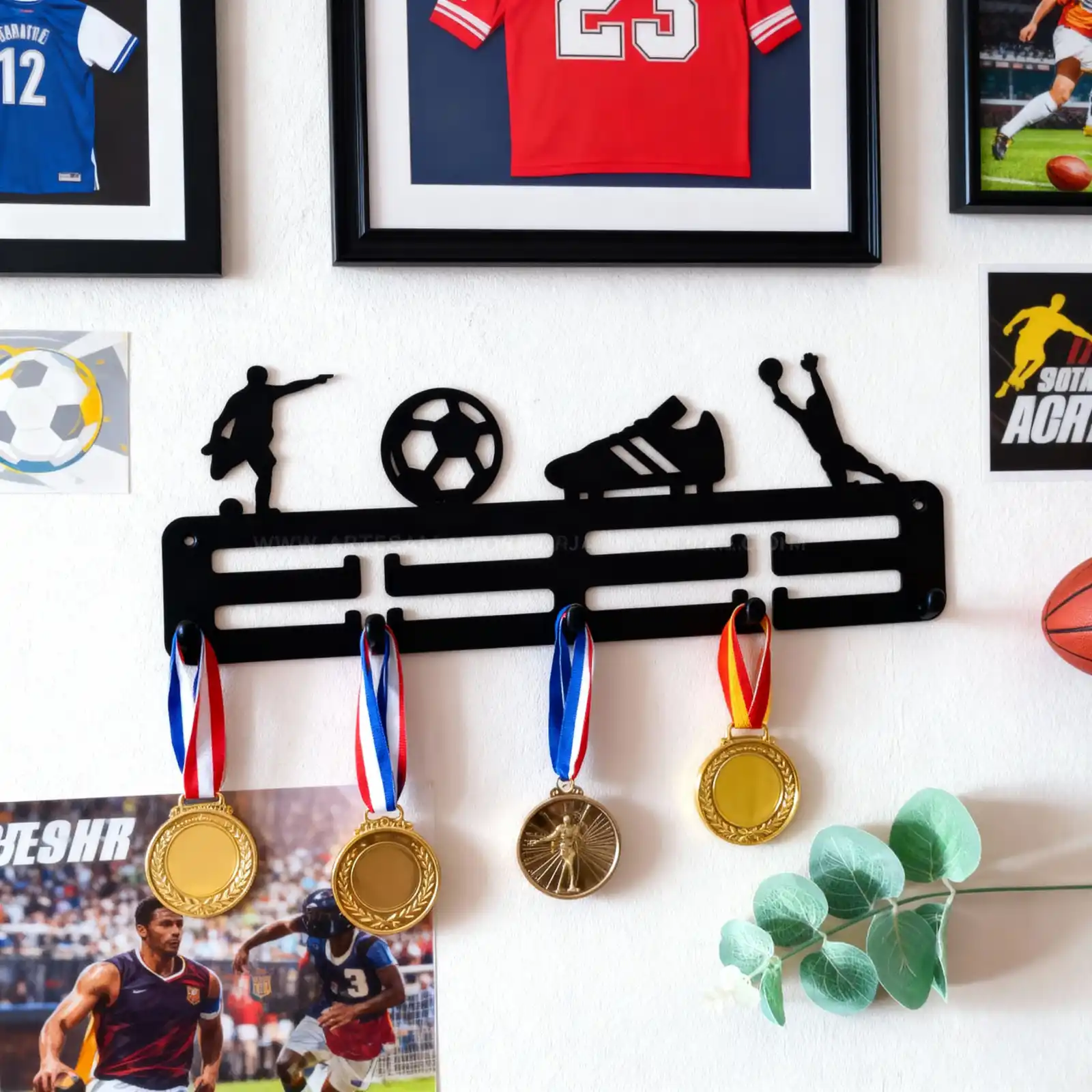 Cada pieza está pensada para mantener tus medallas visibles y seguras, aportando orden y un toque decorativo que refleja tu pasión por el fútbol. ¡No más medallas guardadas en cajas! Exhibe tus logros como verdaderos trofeos.